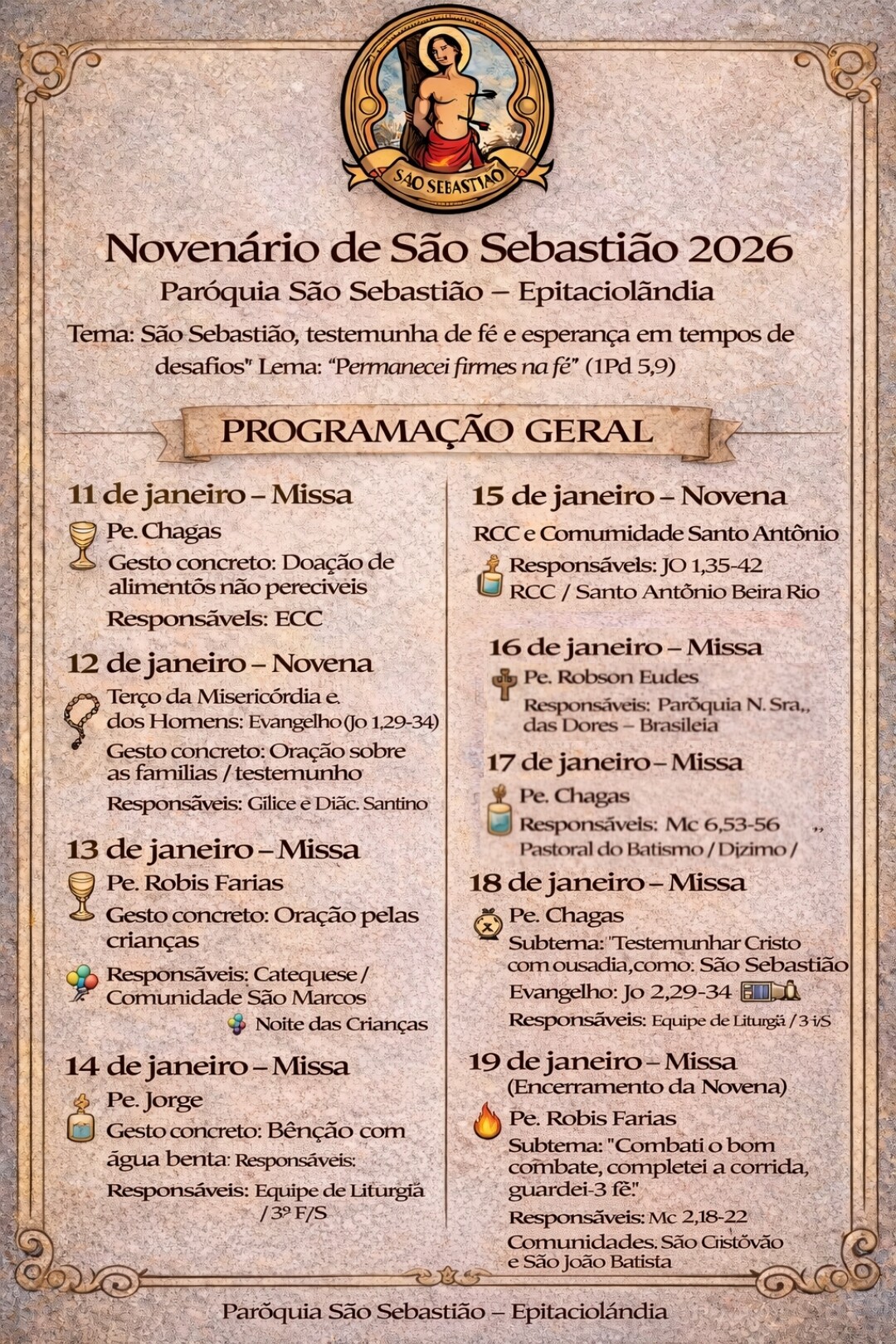 Tema Geral: “São Sebastião, testemunha de fé e esperança em tempos de desafios” Lema: “Permanecei firmes na fé” (1Pd 5,9)